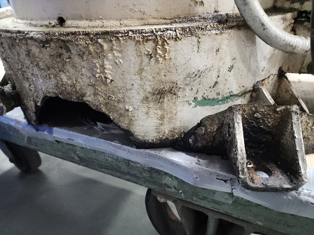 Customer's spin dryer and several cracks and had actually started to come apart. We ground out and drilled the ends of all the cracks and fully welded them back together. In order to keep the cracks from coming back we fully welded a 1/4" steel plate all the way around the dryer base. We are confident we have added years of life to this machine and helped our customer get back up and operational without having to spend several thousands of dollars for a dryer.