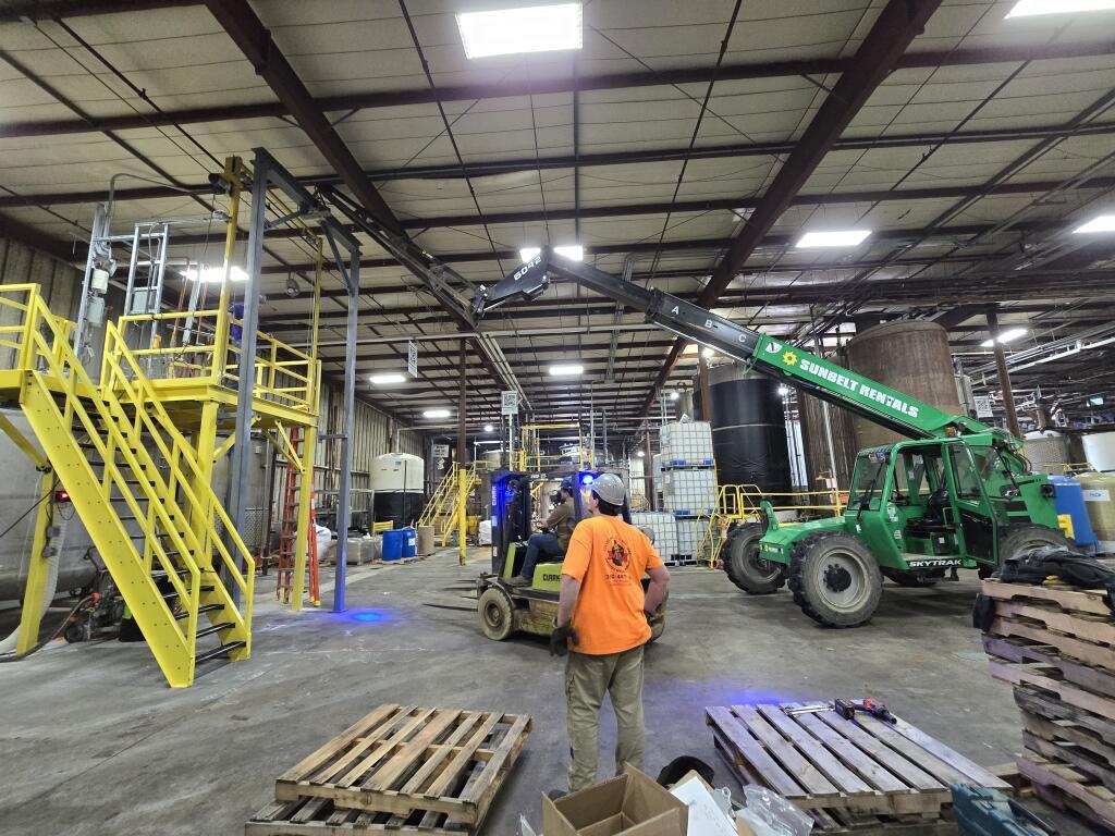 Custom steel mixer platform with a guillotine style gate and Hoist Frame. Designed, engineered, fabricated and installed by M&M