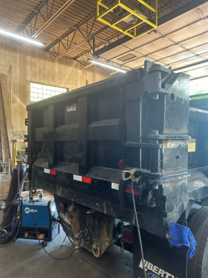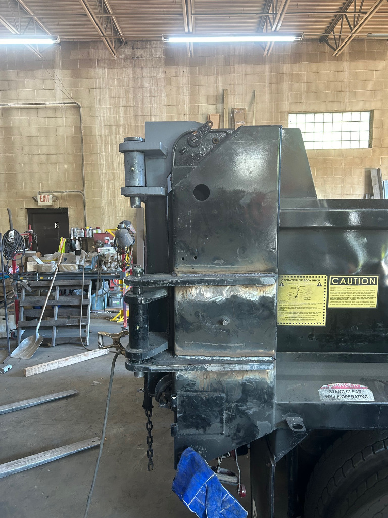 Dump truck gate converted to a heavy duty, dual-function tailgate for easy loading and dumping capability.